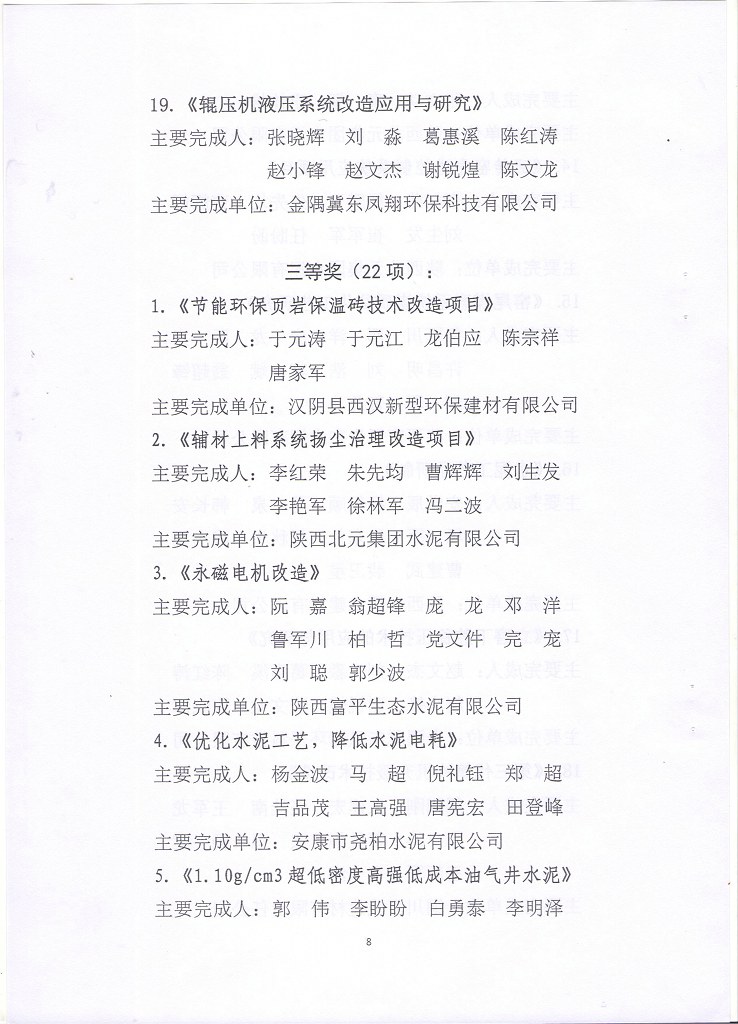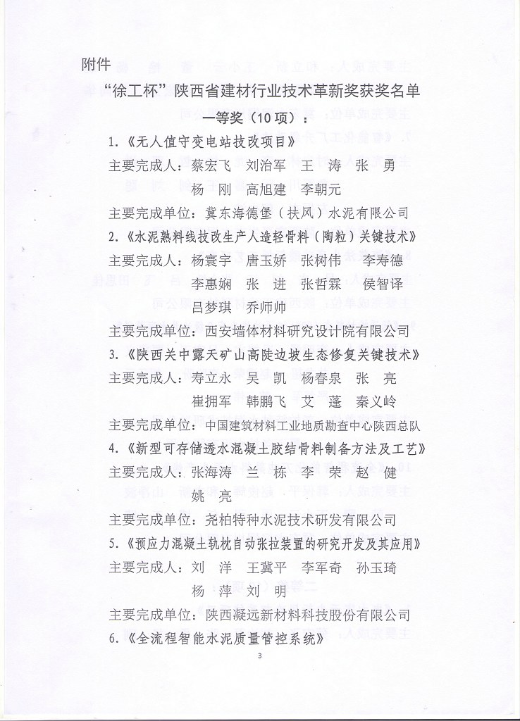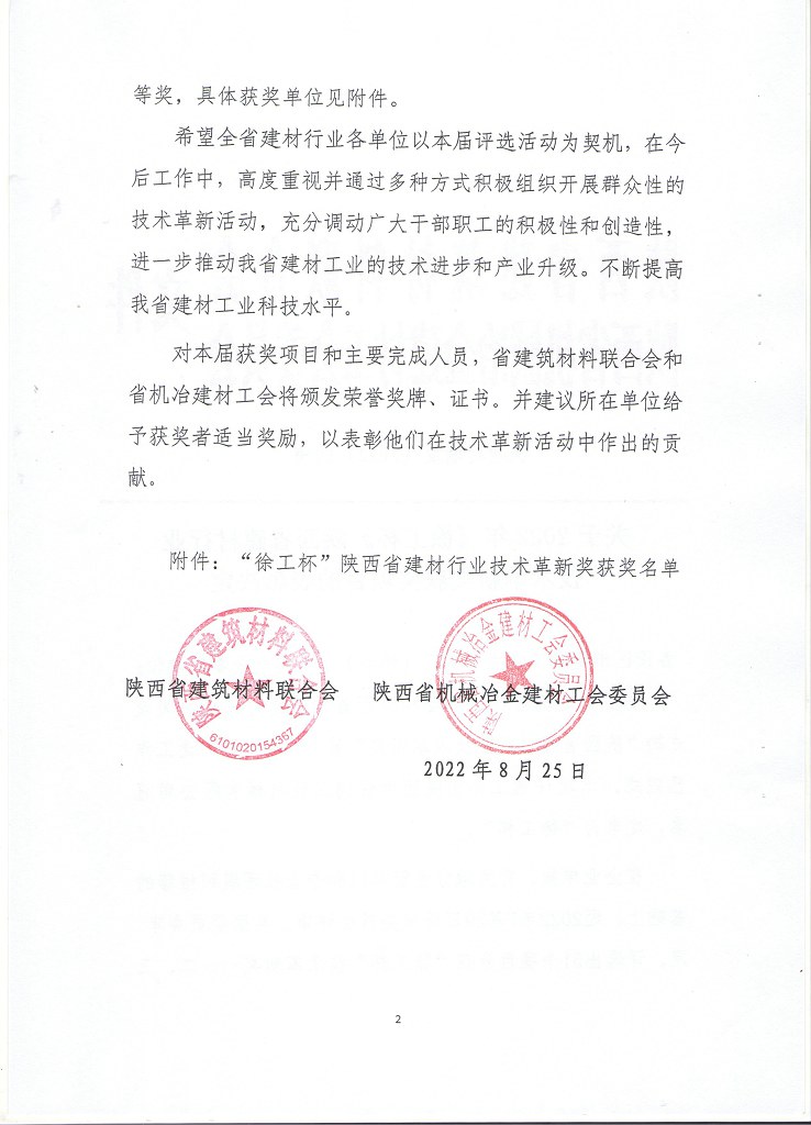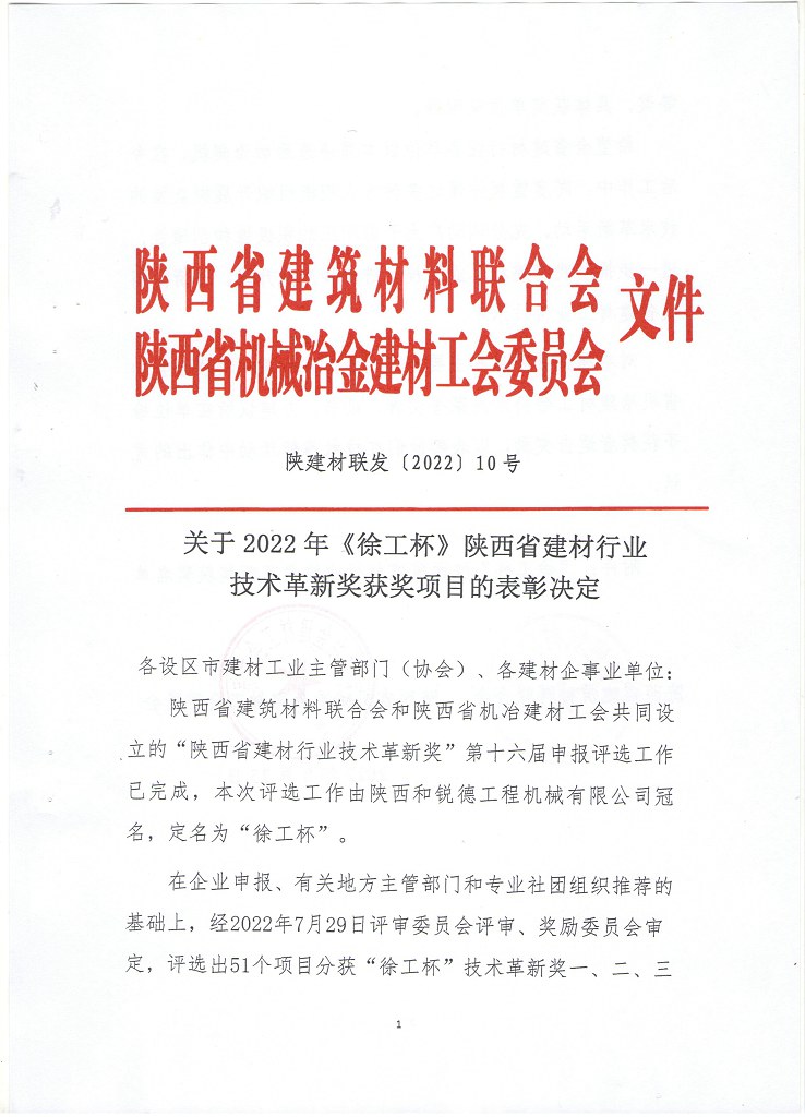 关于2022年《徐工杯》陕西省建材行业技术革新奖获奖项目的表彰决定